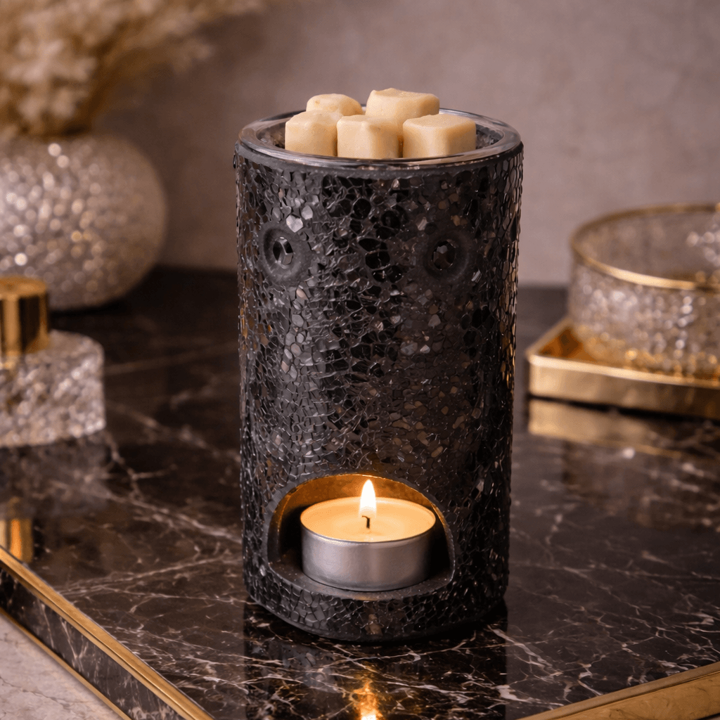 Ένας εντυπωσιακός αρωματιστής χώρου σε μαύρο μωσαϊκό γυαλί, σχεδιασμένος για να προσθέτει κομψότητα και ατμοσφαιρικό φωτισμό σε κάθε χώρο.