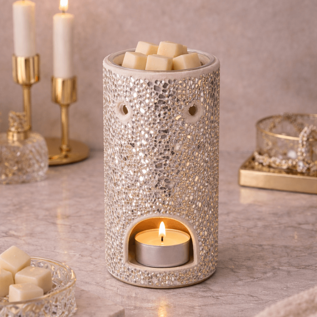 Ένας εντυπωσιακός αρωματιστής χώρου σε ασημί μωσαϊκό γυαλί, σχεδιασμένος για να προσθέτει κομψότητα και ατμοσφαιρικό φωτισμό σε κάθε χώρο.